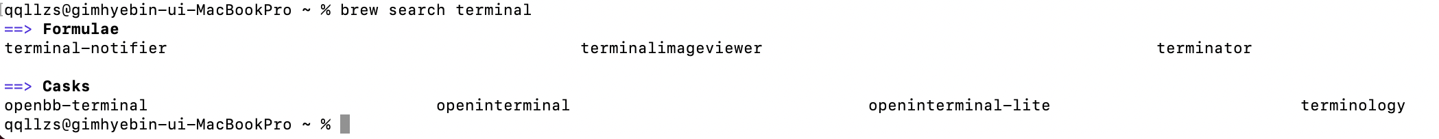 착각일 수 있어서 한 번 brew search terminal을 입력해보았고, 결과는 . .