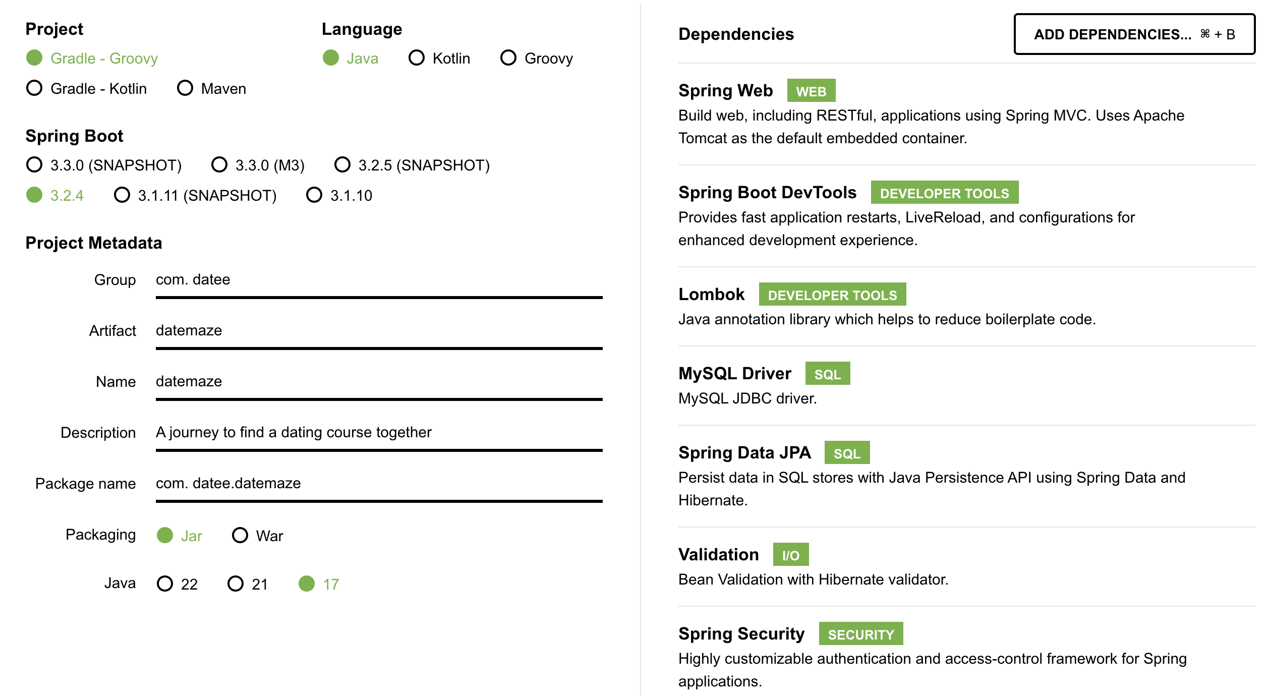 기본적으로 사용할 spring, jpa, lombok, validation을 추가했다.