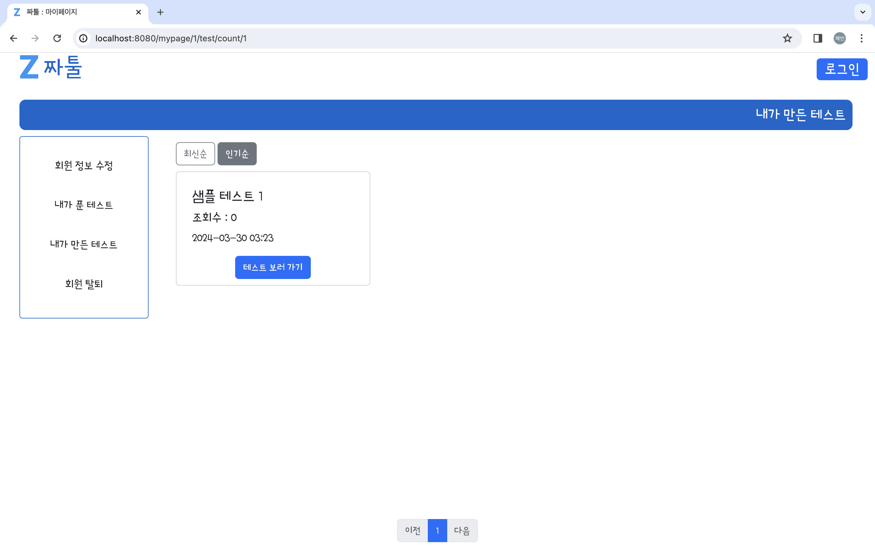 내가 만든 테스트를 최신순으로 혹은 인기순으로 확인할 수 있도록 구현했다.